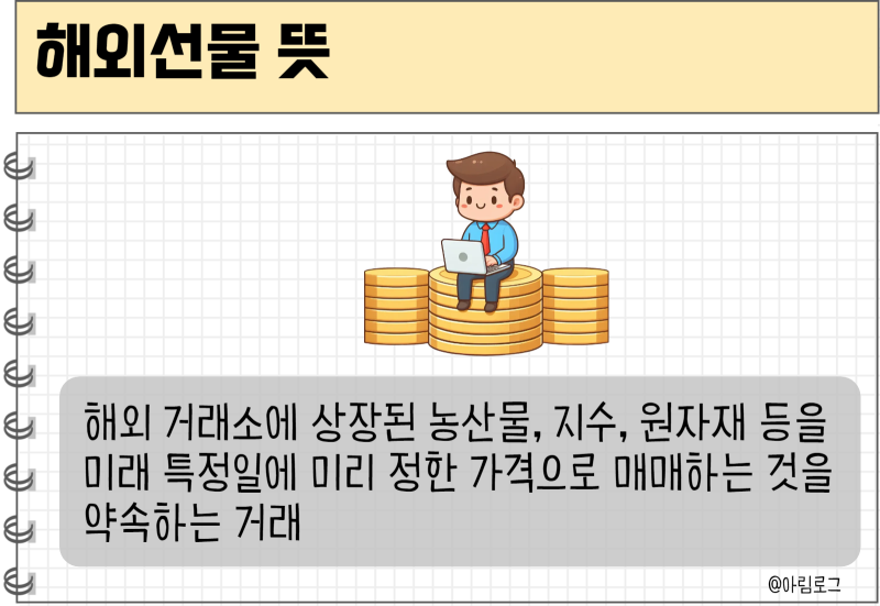 해외선물이란? 전세계 주요 선물거래소에 상장된 금융선물, 상품선물을 대상으로 하는 선물거래를 말합니다. 예시* 사장님이 해외로 이사가셨습니다.* 그럼 이제 농부와 선물거래를 할 수 없나요?* 해외에서도 배추 현물가격이 같다고 가정하면 돈만 교환하면 됩니다.* 선물을 2,500에 거래했으니까. 만원, 4,000원이 되면 농부가 1,500원을 보내고, 1,000원이 되면 사장님이 1,500원을 보냅니다.* 양배추가 된다면 4,000원* 농부가 1,500원을 보내고 주변 사람에게 양배추를 4,000원에 팔면 가격은 2,500원이 되어 500원을 얻습니다.* 주인은 1,500원을 받고 주변 사람에게 양배추를 4,000원에 사서 삽니다. 2,500원에 김치를 3,000원에 팔면 500원을 벌 수 있다. 원을 만드세요.